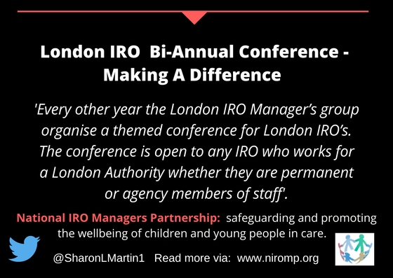 I am not sure that all the attendees are aware that the IRO managers put on this conference without any financial budget or admin support other than the Local Authority hosting the conference providing the venue and if we are lucky, providing tea and coffee. The pre-conference advertising, registration and organisation are done by a small number of managers who fit it in around their day job. I would also like to acknowledge the work done by Viv Parker and Amanda Checkley from the London Practitioners group, both before and on the day in managing the registration table.