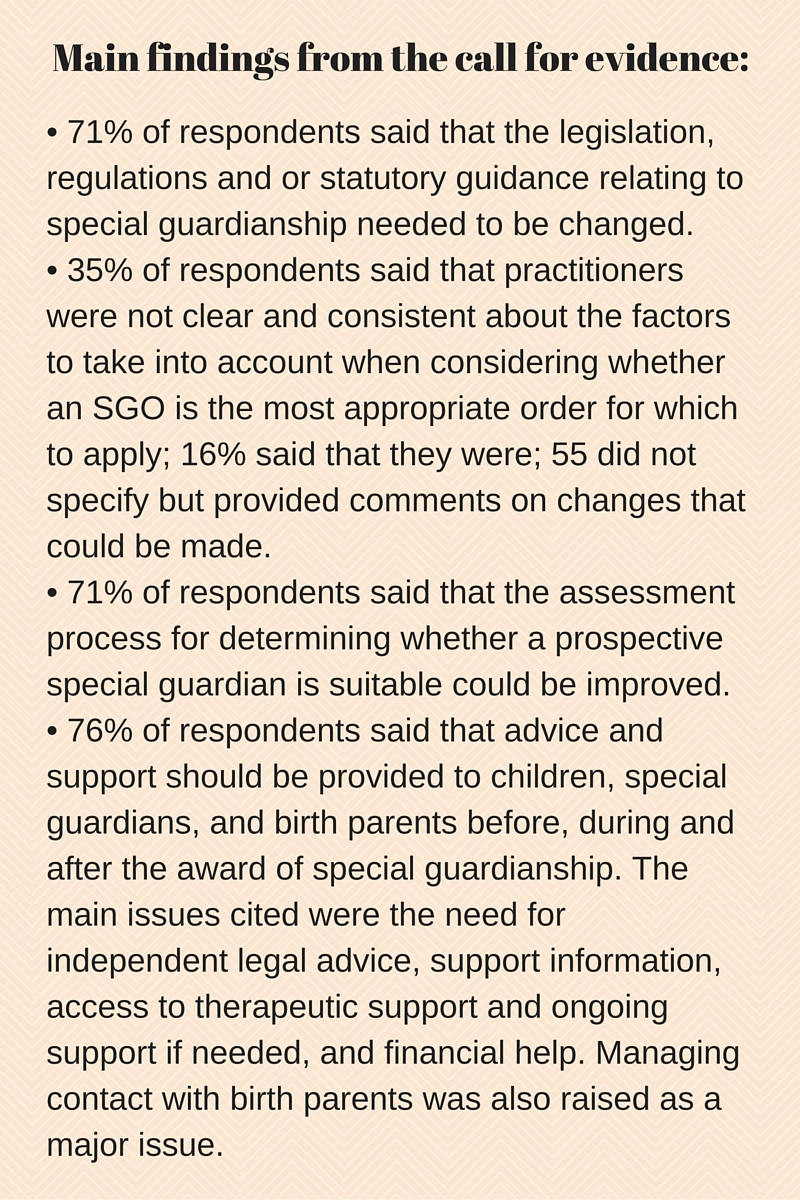The government has also used a Call for Evidence to consult on the use of Special Guardianship. See a summary of the responses below or download the full report at source here: Special guardianship review: report on findings Government consultation response