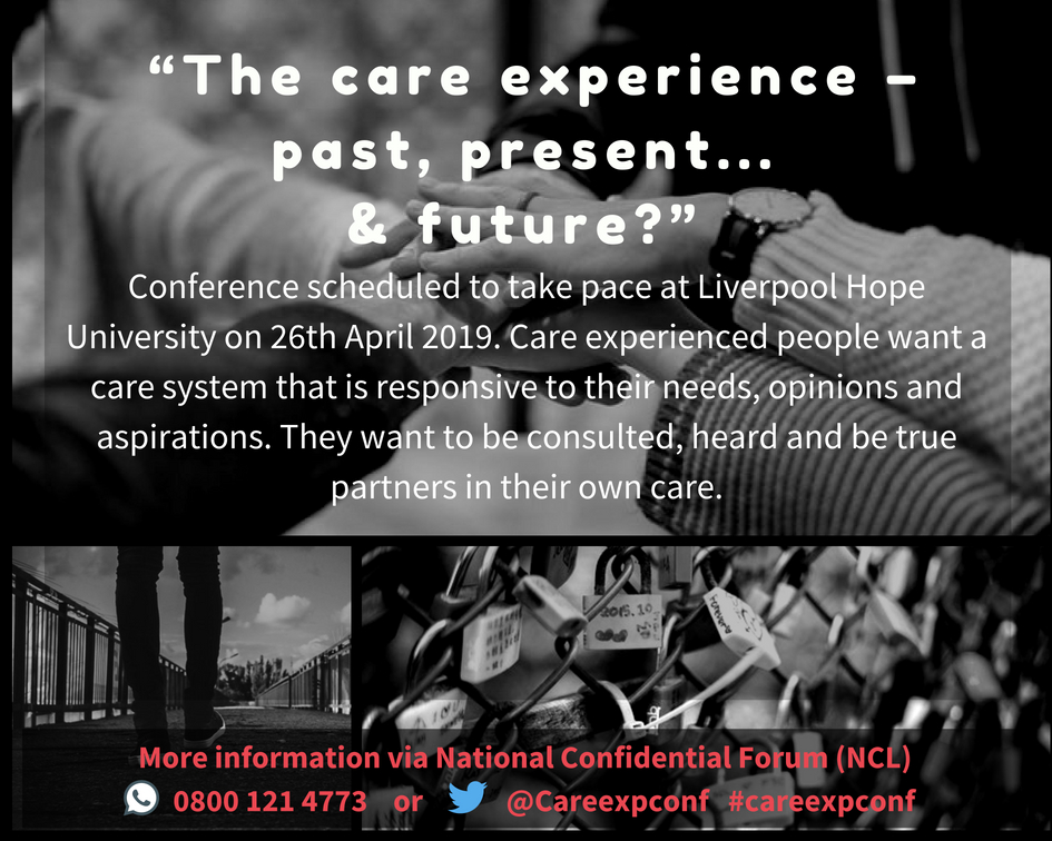 Speaking with fellow care experienced people, many remark about not feeling part of their care, not feeling consulted or cared for and not having care and aftercare plans that meet their needs as they perceive them. This was one of the driving forces that led to the call for a conference for care experienced people of all ages “The care experience – past, present…& future?” scheduled to take pace at Liverpool Hope University on 26th April 2019. Care experienced people want a care system that is responsive to their needs, opinions and aspirations. They want to be consulted, heard and be true partners in their own care.