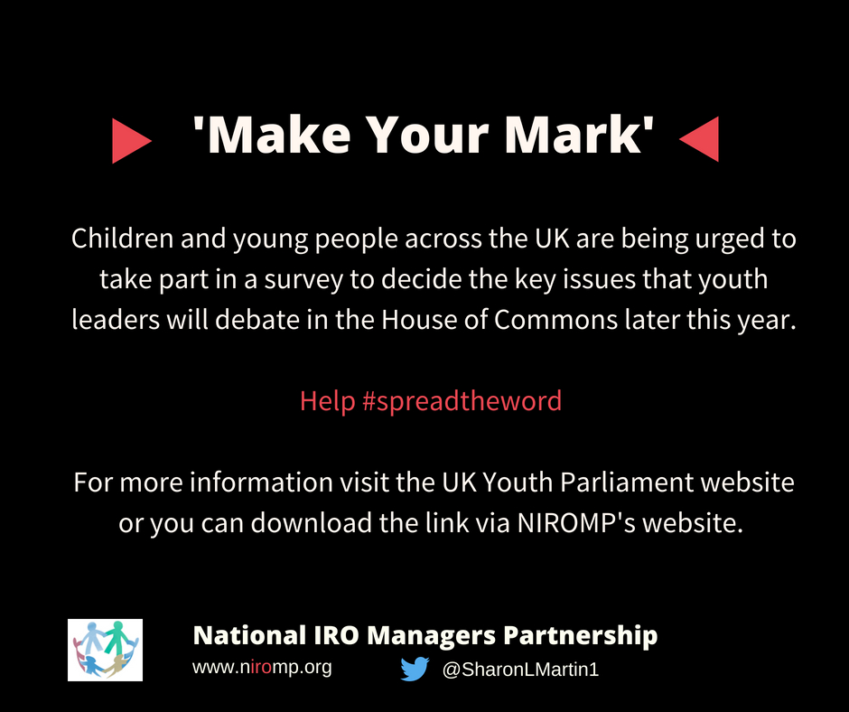 The UK Youth Parliament has launched a Make your mark survey of the views of young people aged 11-18. Young people are invited to take part in the ballot to decide what members of the UK Youth Parliament should debate and vote on to be their campaign in 2019. The survey closes on 10 October 2018.