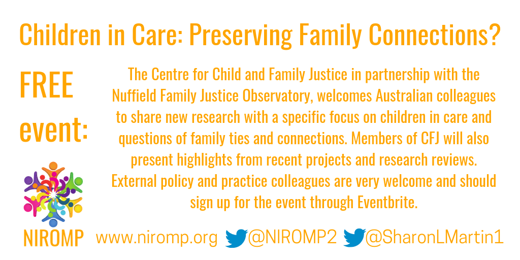 The Centre for Child and Family Justice in partnership with the Nuffield Family Justice Observatory, welcomes Australian colleagues to share new research with a specific focus on children in care and questions of family ties and connections. Members of CFJ will also present highlights from recent projects and research reviews. External policy and practice colleagues are very welcome and should sign up for the event through Eventbrite: https://www.eventbrite.co.uk/e/children-in-care-preserving-family-connections-tickets-70603842995