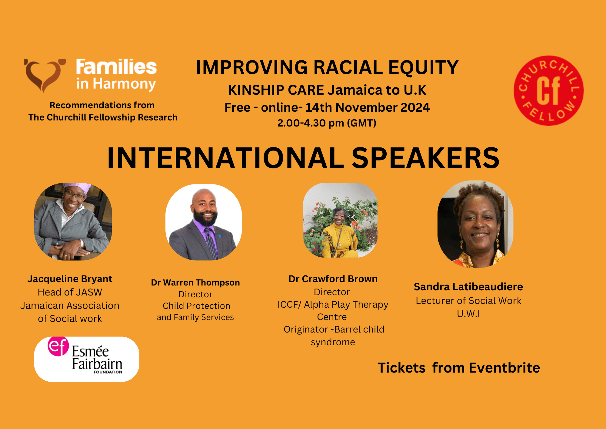 Families In Harmony are inviting you to join their free event, Improving Racial Equity In Kinship Care: Jamaica to UK Insights from The Churchill Fellowship Research, online, on Thursday, 14 November, 2.00 – 4.30pm.