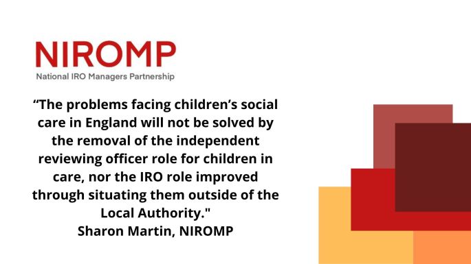Over 80% of Community Care readers vote to keep the IRO role with 49% voting for IROs to be employed outside local authorities. The National Independent Reviewing Officer Managers Partnership is committed to improving the practice that impacts on the lives of children and families. Critical analyses provided by the independent children’s social care review, … Continue reading NIROMP responds to results of Community Care poll ‘What should happen to the IRO role?’