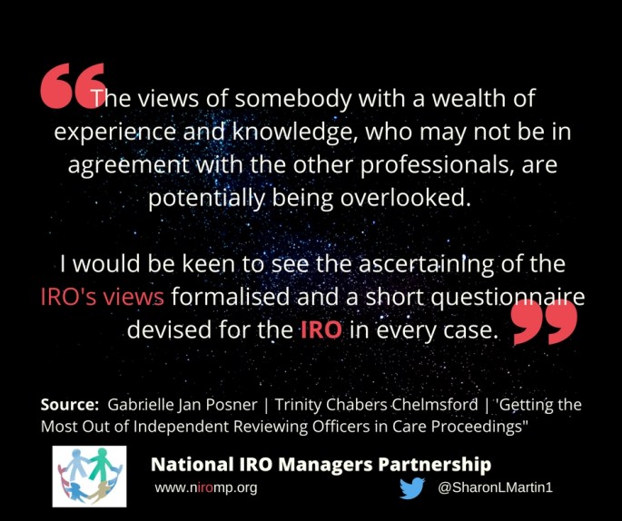 Thank you to Gabrielle Jan Posner and Trinity Chambers Chelmsford for this helpful post which sets out why IRO's views could helpfully be formalised as part of legal proceedings:Ā Getting the Most Out of Independent Reviewing Officers in Care Proceedings NIROMP and Cafcass are working collaboratively to promote greater consistency of best practice - to ensure … Continue reading Independent Reviewing Officers in Care Proceedings