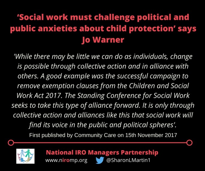 ‘Social work must challenge political and public anxieties about child protection’ Originally published in Community Care on November 15, 2017. There needs to be robust and honest dialogue about the uncertainties and complexities of child protection social work, and the policies needed to achieve real change, says Jo Warner. [...] social work’s mandate to intervene … Continue reading New piece by @JoWarner01 #IROConf17