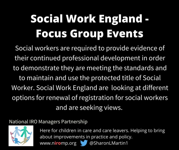 Hello Colleagues, Please can you circulate within your IRO and social work networks. Social Work England want to ensure good sector involvement relating to re-registration and CPD audit system:Ā Continued Fitness to Practice focus group - invite to join focus group Getting involved in the consultation is a great opportunity to shape the future by sharing … Continue reading Social Work England Continued Fitness to Practice Framework – Sector Involvement.