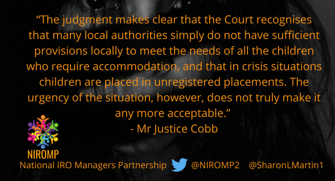#SCRAPSI445, CHILD PROTECTION, CHILDREN IN CARE, CHILDREN'S RIGHTS IN CARE, STATUTORY INSTRUMENT 445 Thank you Article 39 for your continued work to promote and protect every child’s rights on the basis of equality and non-discrimination. We stand with you.Sharon Martin, chair of the National IRO Managers Partnership (NIROMP) Articles 39 children’s rights charity has been granted permission for a … Continue reading REMOVAL OF SAFEGUARDS FOR CHILDREN IN CARE – JUDICIAL REVIEW GIVEN GO AHEAD