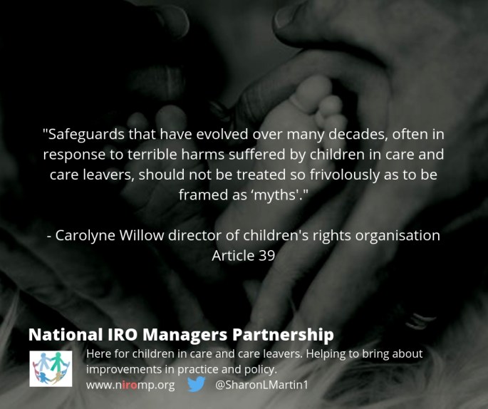 NIROMP has joined forces with 49 other organisations and social work experts to urge the withdrawal of key sections of new āmyth bustingā guide about England's care system. The so-called 'myth busting' guidance is on the Childrenās Social Care Innovation site.The joint letter was sent to the Minister for Children and Families today, and copied to … Continue reading Concern expressed over “misleading” myth-busting guide