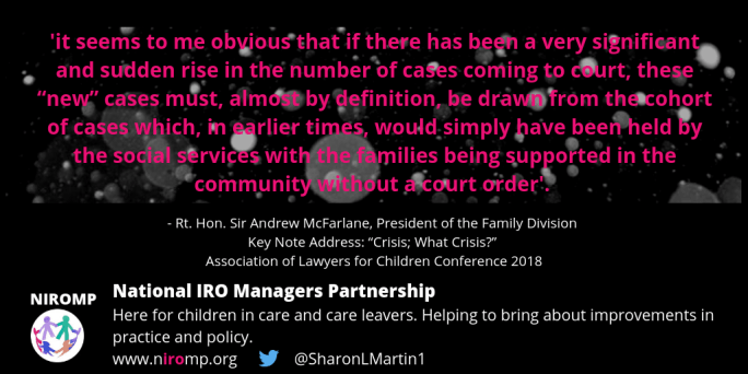 Rt. Hon. Sir Andrew McFarlane, President of the Family Division recently Key Note Address: “Crisis; What Crisis?”Association of Lawyers for Children Conference 2018 23 November 2018. This conference is meeting at a time when an unprecedented number of applications are being made each month by local authorities for care or supervision orders in relation to children. … Continue reading Keynote by Rt. Hon. Sir Andrew McFarlane “Crisis; What Crisis?”