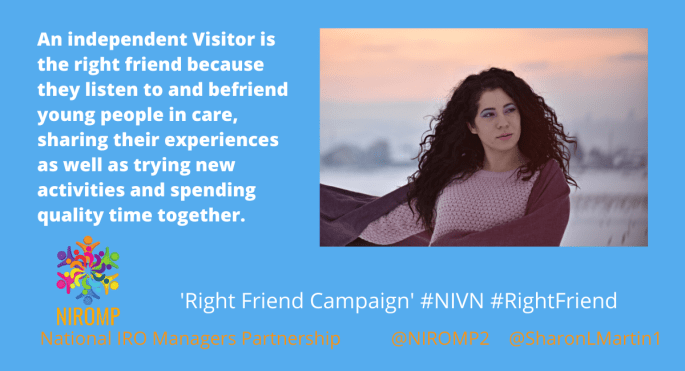 Guest post by the National Independent Visitor Network (NIVN) Volunteers’ Week took place online at the beginning of June and marked the online launch of The Right Friend Campaign by the National Independent Visitor Network (NIVN).  IV Coordinators, IVs and care-experienced children and young people posted tweets expressing why an IV is the right friend; … Continue reading Guest post: How independent reviewing officers can support ‘My Right Friend’ | @IV_Network