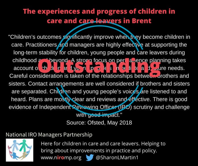The views expressed in this post are those of the author and do not necessarily reflect the position of the National IRO Managers Partnership. Guest post by Ian Dickson on June 3, 2018 I am a care experienced person. I am also a social worker, and one who spent years managing and then inspecting residential services. One … Continue reading Guest post | My thoughts on the role of the IRO | By Ian Dickson