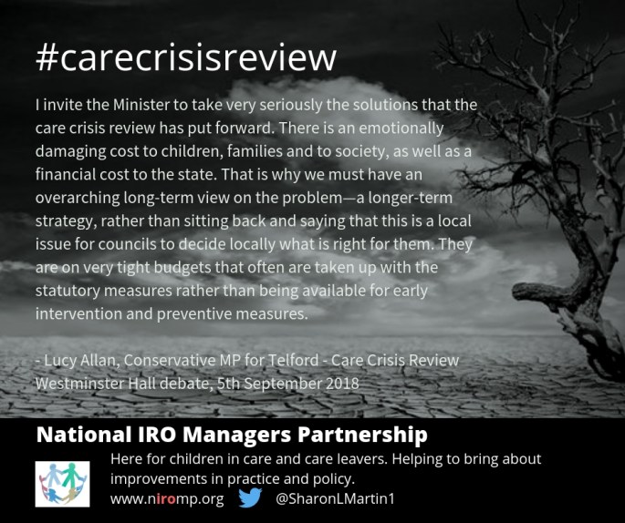 "[...] we care about families. We care about people being able to help themselves. We believe in helping people to help themselves, but we are not doing that. We are simply saying, "The state will take care of this, because you have failed as a parent." What message does that send about our vision of … Continue reading #carecrisisreview