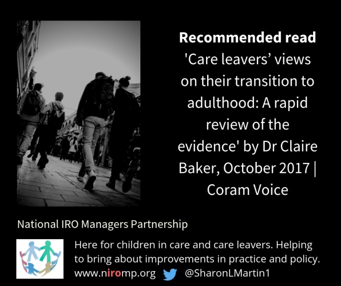 In 2017 Coram Voice conducted a rapid review of around 80 UK studies that explored care leavers’ own accounts of their experiences and feelings. This is a summary of the key themes and issues that emerged from the review. The quotes used in this review are from the young people interviewed or consulted in the … Continue reading Care leavers’ views on their transition to adulthood | Coram Voice