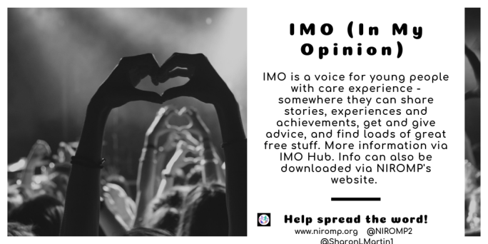 Information for professionals IMO (‘In My Opinion’) has been created in collaboration with the Children’s Commissioner’s Office and care experienced young people to provide a voice for young people in care and care leavers to share advice, experience, and stories with one another. The site has young people’s voices at its heart, and all of … Continue reading In My Opinion