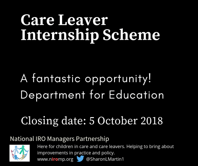 https://twitter.com/IsabelleTrowler/status/1039159172078731266 Location Aldershot, Andover, Birkenhead, Birmingham, Bristol, Chelmsford, Coventry, Croydon, Darlington, Eastleigh, Glasgow, High Wycombe, Leeds, London, Manchester, Milton Keynes, Newcastle-upon-Tyne, Nottingham, Peterborough, Reading, Sheffield, Swansea, Warrington, Watford About the job Job description What is the Care Leaver Internship Scheme? The Care Leavers Internship Scheme supports the cross-government Keep on Caring strategy. By signing up … Continue reading Opportunities for care leavers in the Civil Service through one-year internships in Government departments