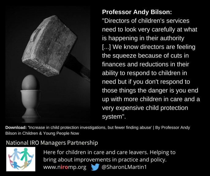 "In other words, more children are being put through an investigation that doesn't lead to a child protection plan and more parents are being put through the wringer." says Professor Andy Bilson Please read and discuss full piece at source: Increase in child protection investigations, but fewer finding abuse | Children & Young People Now
