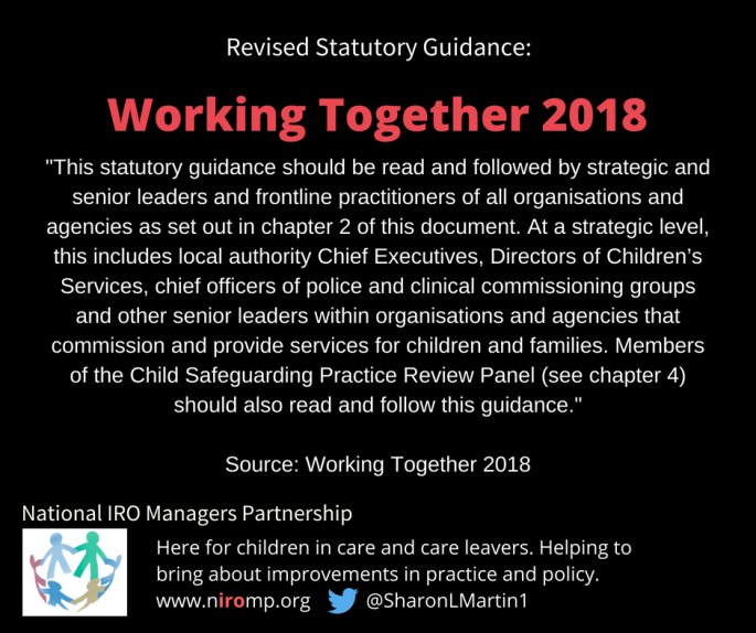 IROs, all practitioners, should read this statutory guidance in full. Comment by Sharon Martin, NIROMP Chair "I am pleased to see that there has been some strengthening of the child's voice in the guidance, but I am disappointed that the government has not taken the opportunity to strengthen children's rights in the new guidance". What children … Continue reading New: Revised Statutory Guidance – Working Together 2018