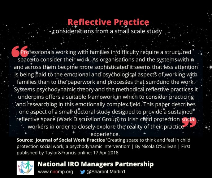 https://twitter.com/UKRCPR/status/992442983680274435 Thank you to the Journal of Social Work Practice and to Taylor & Francis Online for providing open access to this article. Abstract Professionals working with families in difficulty require a structured space to consider their work. As organisations and the systems within and across them become more sophisticated it seems that less attention … Continue reading Creating reflective spaces